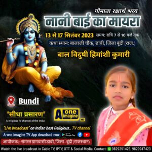 जिला बूंदी के बालाजी चौक, डाबी में समस्त ग्रामवासी डाबी, बूंदी के तत्वाधान में दिनांक 13 से 17 सितंबर तक सायं:- 7 बजे से रात्रि 10 बजे तक कथा प्रवक्ता : बाल विदुषी हिमांशी कुमारी के श्रीमुख नानी बाई रो मायरो का आयोजन होगा।