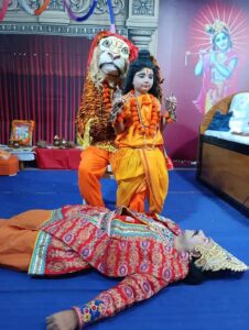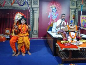 कथा व्यास जी कहा कि भगवान विष्णु के नृसिंह अवतार की कथा तो हम सभी जानते हैं। हिरण्यकश्यप जैसे अधर्मी को मारने और भक्त प्रह्लाद की रक्षा के लिए विष्णु भगवान नृसिंह अवतार लेकर स्तंभ में से प्रकट हुए। उन्होंने हिरण्यकश्यप को उठाया और महल की चौखट पर लाकर अपनी गोद में लिटा लिया और अपने नाखूनों से उसका सीना चीर दिया। लेकिन हिरण्यकश्यप का अंत करने के बावजूद उनका क्रोध शांत नहीं हुआ। जिससे भू लोक, स्वर्ग लोक और पाताल लोक कांपने लगा। प्रभु के क्रोध को शांत करने की शक्ति सिर्फ महाकाल भगवान शिव के पास ही हो सकती थी। सारे देव शिवजी की स्तुति करने लगे। तब जाकर भक्तों की पुकार पर शिव उन्हें शांत करने गए। लेकिन नृसिंह भगवान का क्रोध शांत करने मे वो भी असफल हुए। फिर त्रिकालदर्शी शिवजी ने मानव, चील और सिंह के शरीर वाले भगवान सर्वेश्वर का अवतार लिया। नृसिंह और सर्वेश्वर अवतारों में पूरे 18 दिनों तक युद्ध चला। अंततः भगवान नरसिंह सर्वेश्वर अवतार के आगे कमजोर पड़ने लगे और हार स्वीकार कर अपने क्रोध को शांत किया। सभी देवों ने विष्णु स्तुति की तब भगवान नरसिंह श्रीहरि में लीन हो गए। इस अवसर पर बड़ी संख्या में श्रद्धालु मौजूद रहे।