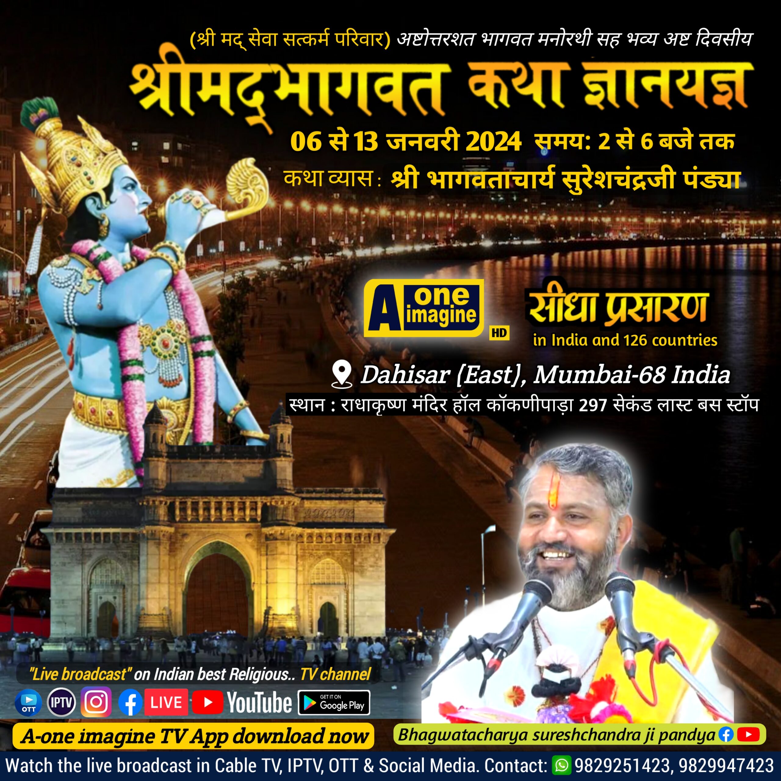 दहिसर राधाकृष्ण मंदिर हॉल कॉकणीपाड़ा, 297 सेकंड लास्ट बस स्टॉप, दहिसर (पूर्व), मुंबई-68 में अष्टोत्तरशत भागवत मनोरथी सह भव्य अष्ट दिवसीय श्रीमद भागवत महोत्सव का दिनांक :- 06 जनवरी से 13 जनवरी 2024 को भव्य आयोजन समय :- दोपहर 2 बजे से सायं 6 बजे तक सम्मान होगा। जिसमे कथा प्रवक्ता – पूज्य भागवताचार्य सुरेशचंद्रजी पंड्या श्रीमुख से वाचन किया जाएगा। कथा के आयोजक – श्री मद् सेवा सत्कर्म परिवार ।