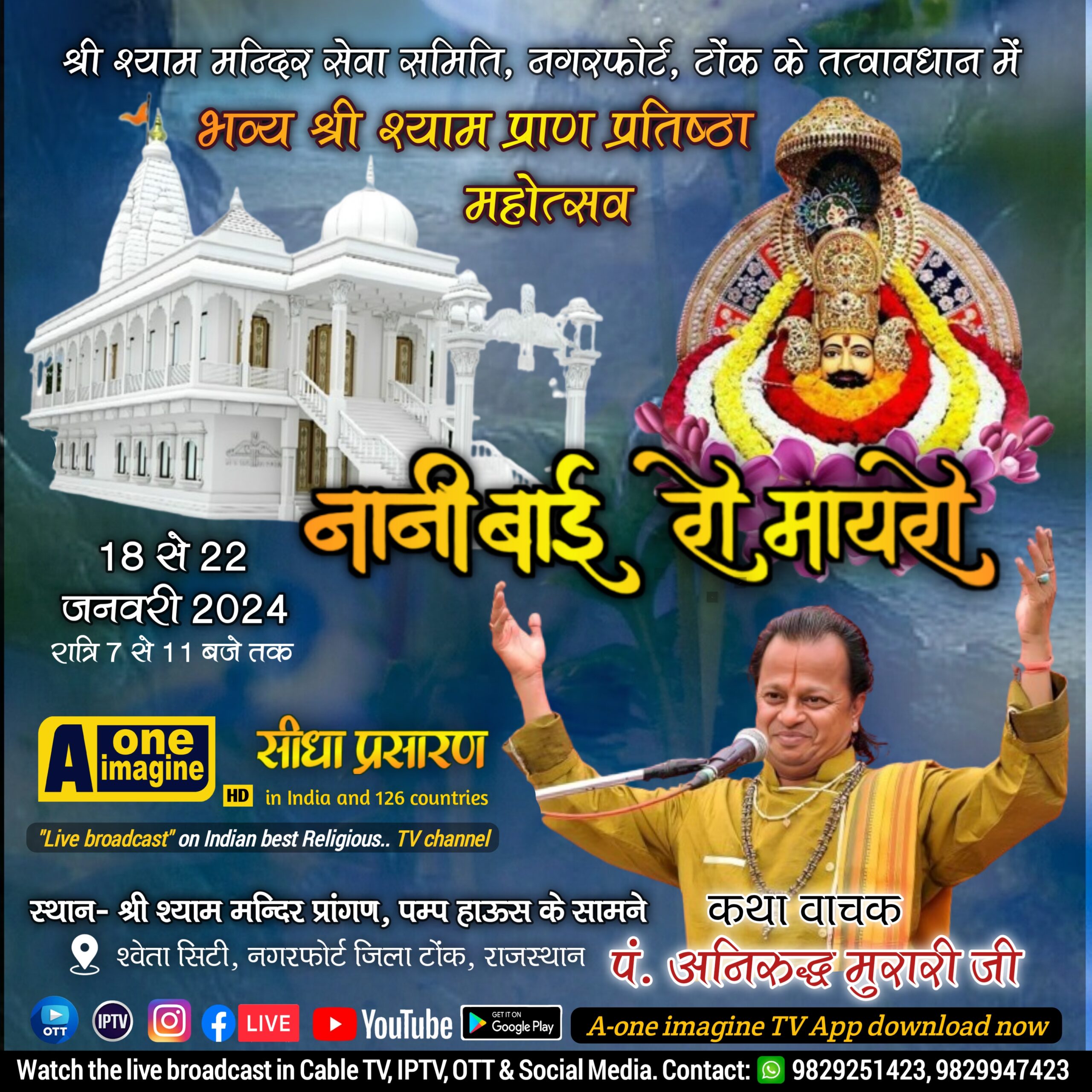 श्री श्याम मन्दिर सेवा समिति, नगरफोर्ट, टोंक के तत्वावधान में नानी बाई रो मायरो, दिनांक : 18 से 22 जनवरी 2024 तक, समय : रात्रि 7 बजे से 11 बजे तक, मायरो वाचक : पंडित अनिरुद्ध मुरारी जी (रतलाम), कथा स्थान : स्थान : श्री श्याम मन्दिर प्रांगण, पम्प हाऊस के सामने, श्वेता सिटी, नगरफोर्ट जिला टॉक राजस्थान से “सीधा प्रसारण”…